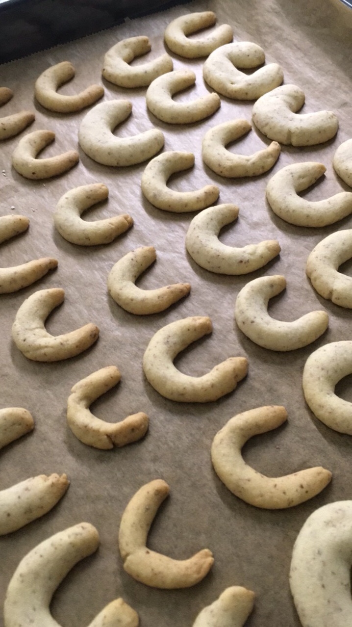 🍪Aus nussgroßen Stücken Kipferln formen, auf einem unbefettetem Blech bei mäßiger Hitze hellgelb backen.