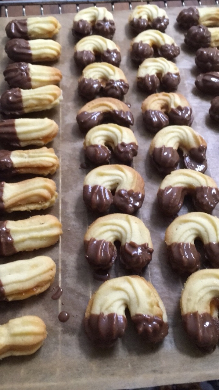 🍪Ein Ende des Stangerl’s und die Enden der Kipferl in Schokolade tauchen. Trocknen lassen.In eine Keksdose geben.