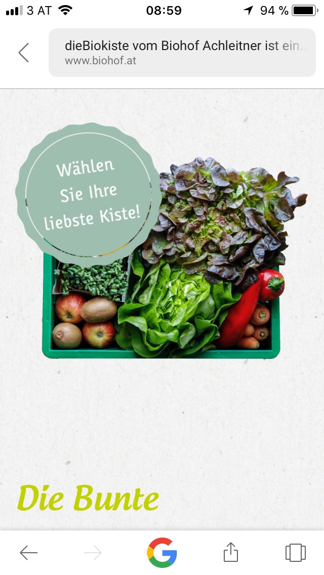 Es begeistert mich immer wieder, mit wieviel Liebe , Details und Aufrichtigkeit das Team vom Biohof Achleitner ihr Konzept macht. Ich bin echt begeistert und kanns jedem der sich gesund ernähren möchte nur empfehlen. Weisst du mal nicht was du mit dem Gemüse aus der Kiste machen sollst, hast du ja den Kundenbrief.