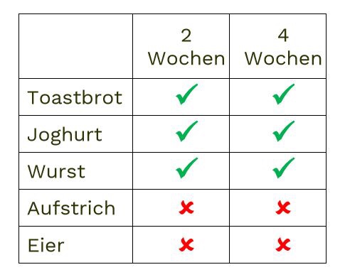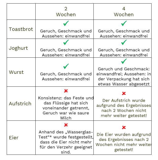 Dazu gibts heute Tabellen vom Antiwegwerfblog wo ihr sehen könnt, das man nicht gleich alles wegschmeißen muss, wenns schon überm Ablaufdatum ist.
