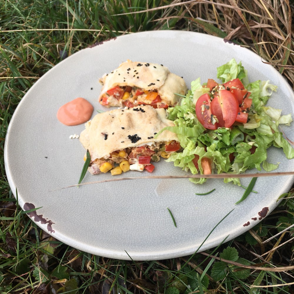 🍕Auf ein Drittel des Teiges geben. Mit Geriebenen Käse und Gewürze bestreuen. Und dann mit Hilfe des Küchentuches einschlagen. Die Enden gut zusammen drücken.