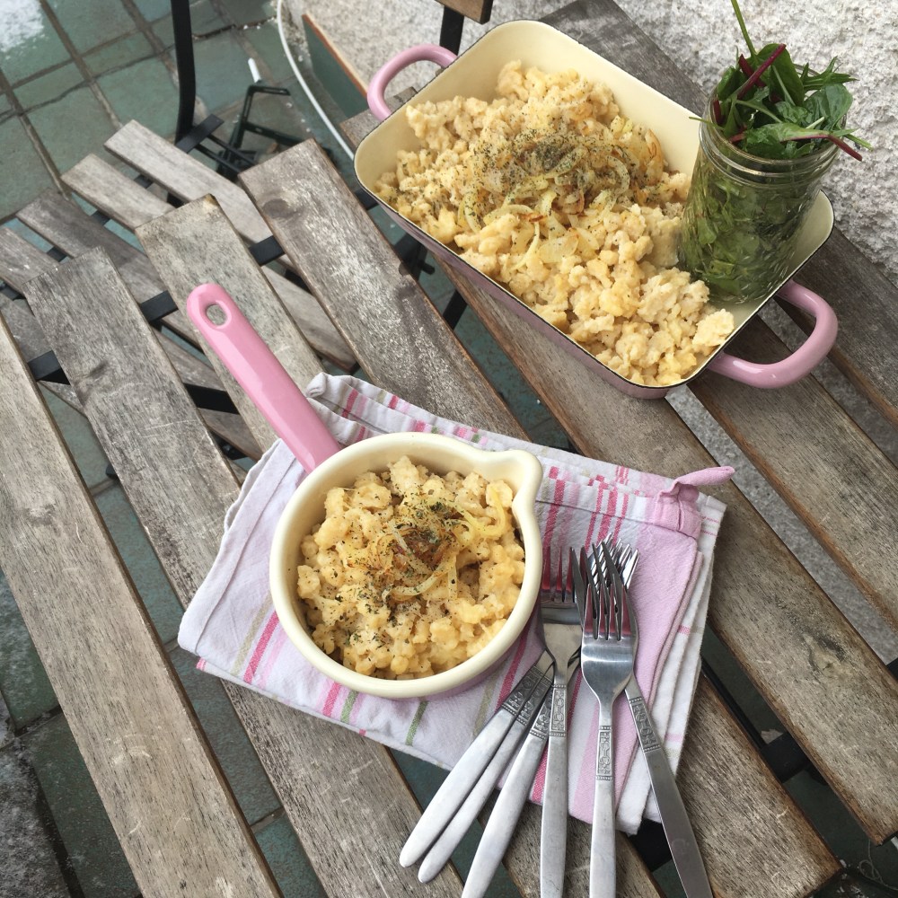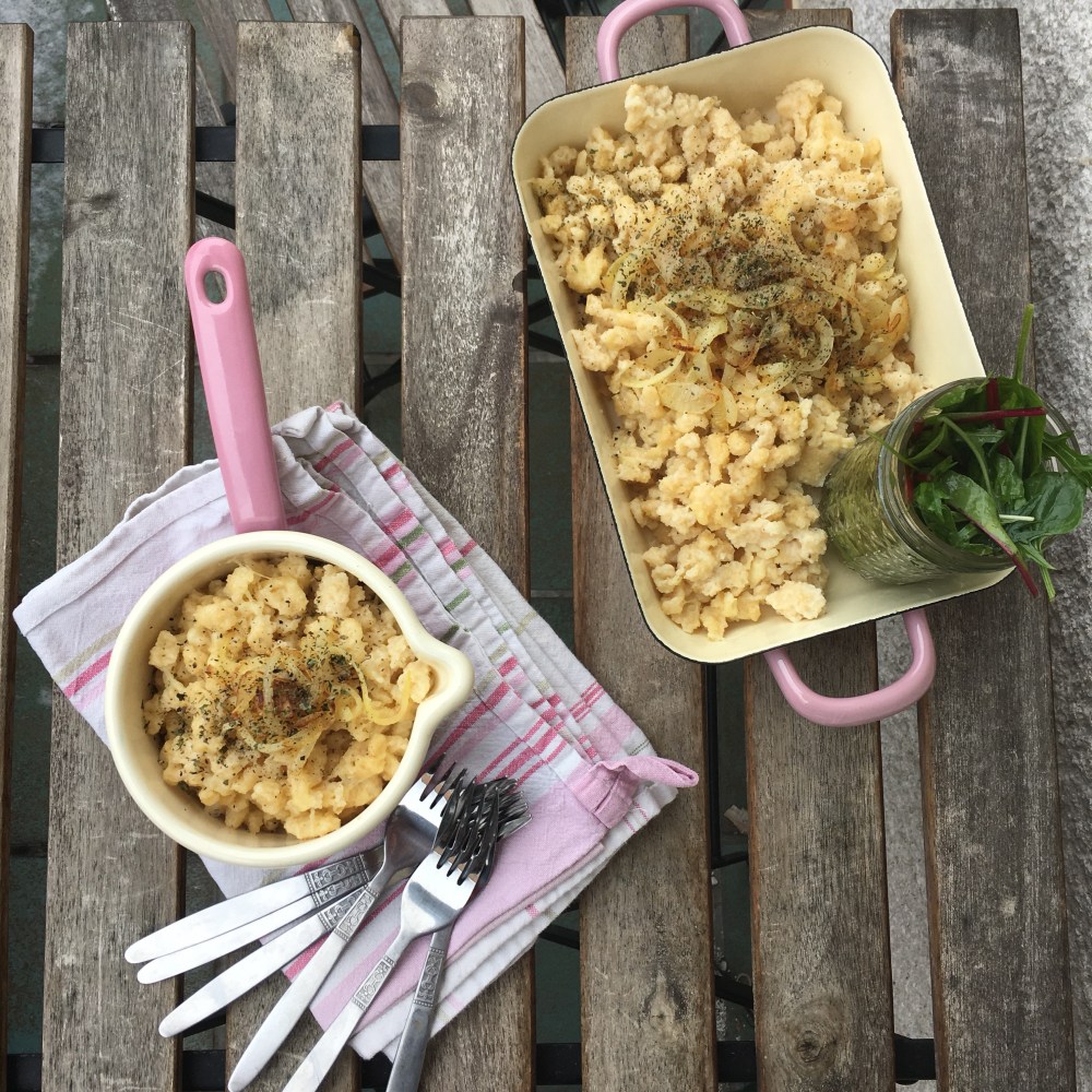 🧀In einem Topf ausreichend Salzwasser aufkochen. Teig durch eine Spätzlehobel ins Wasser gleiten lassen. Herausnehmen und abtropfen lassen.