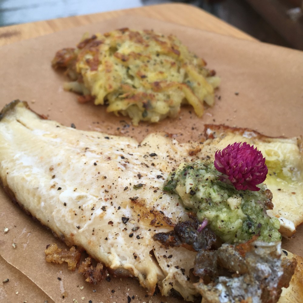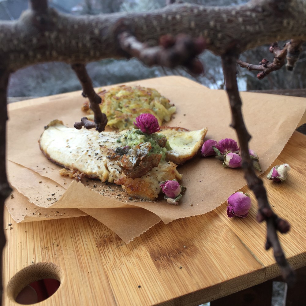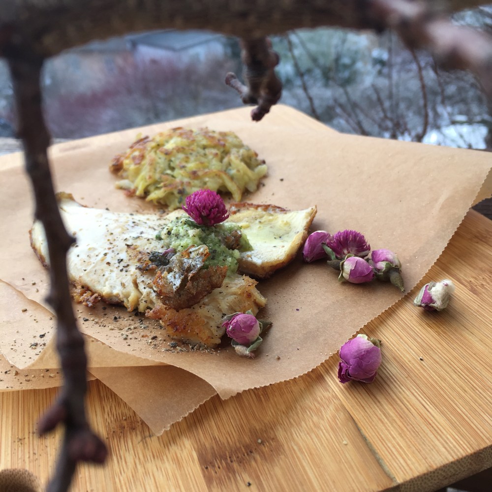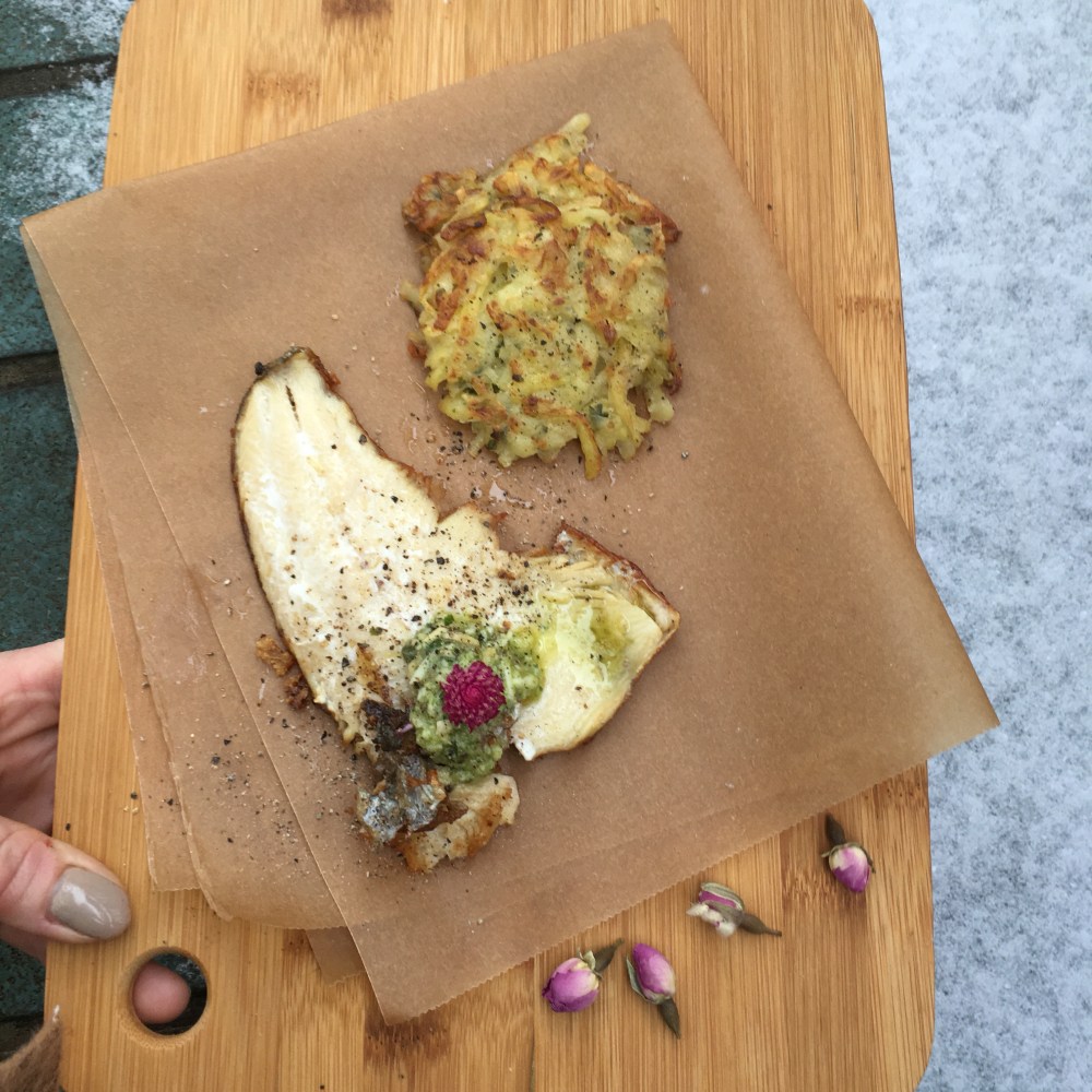 🐠Die Forellenfilets in der Pfanne ebenso herausbraten, würzen nach Geschmack, und mit Kartoffelrösti und Pesto anrichten.