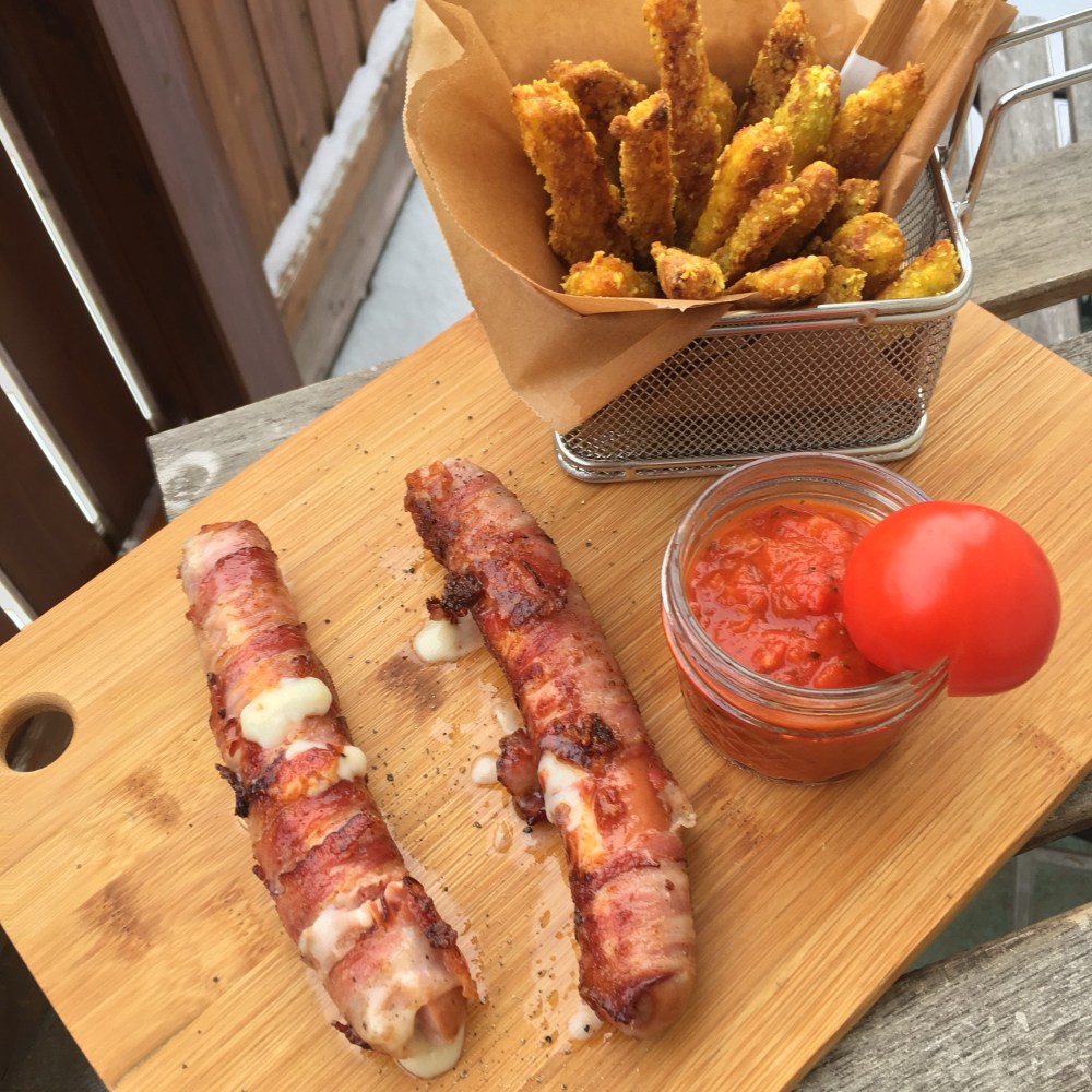 Es gibt leckere Berner Würstel mit knusprigen Kohlrabi Pommes und Low Carb Ketchup😋