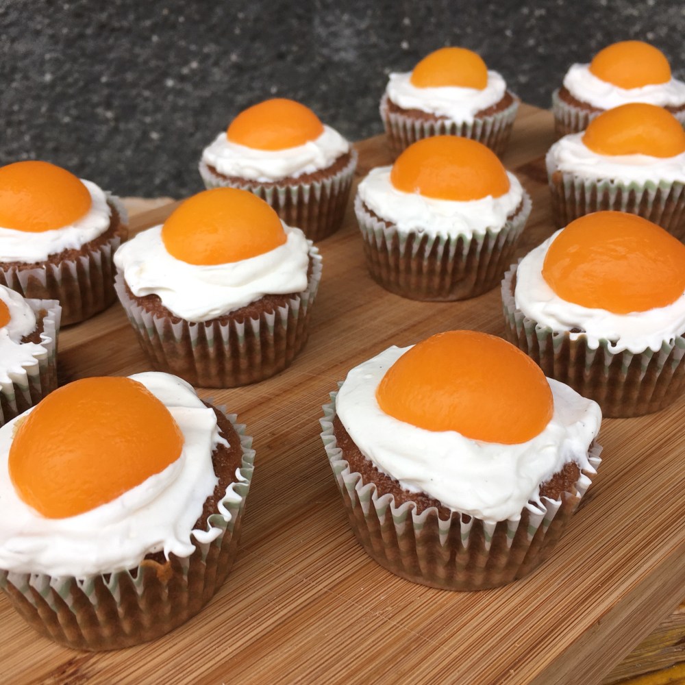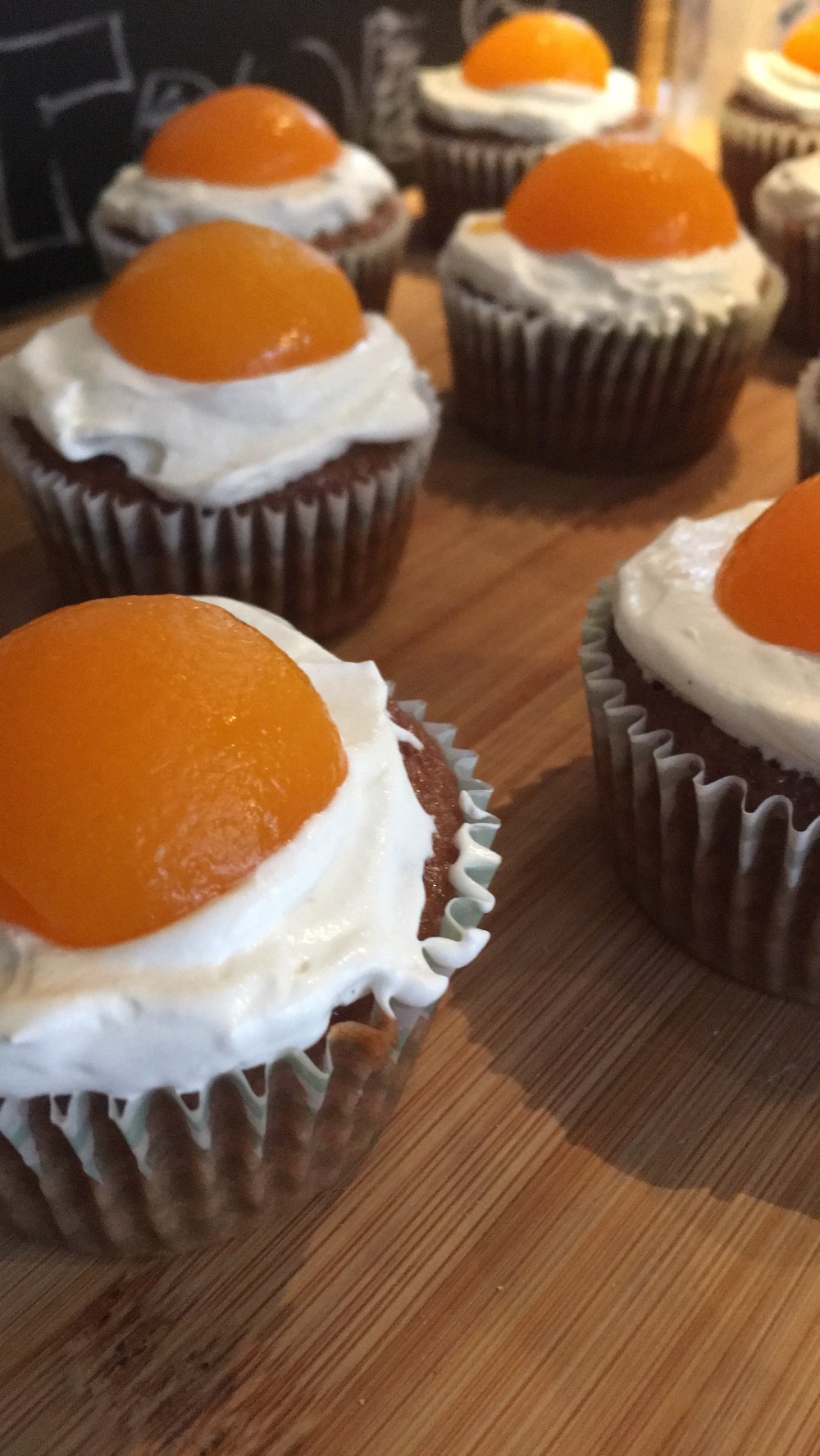 🐰Diese Masse auf die Muffins streichen und mit den halben Hälften der Marillen dekorieren.