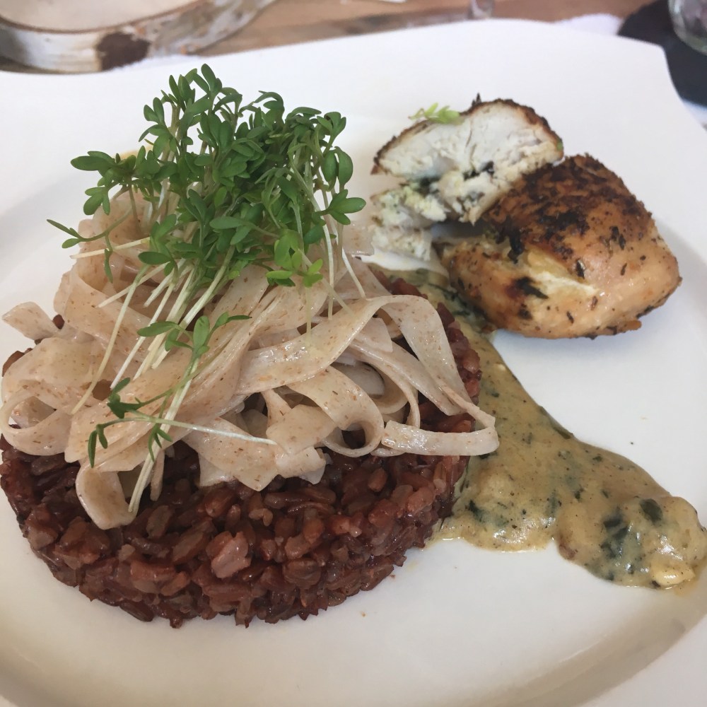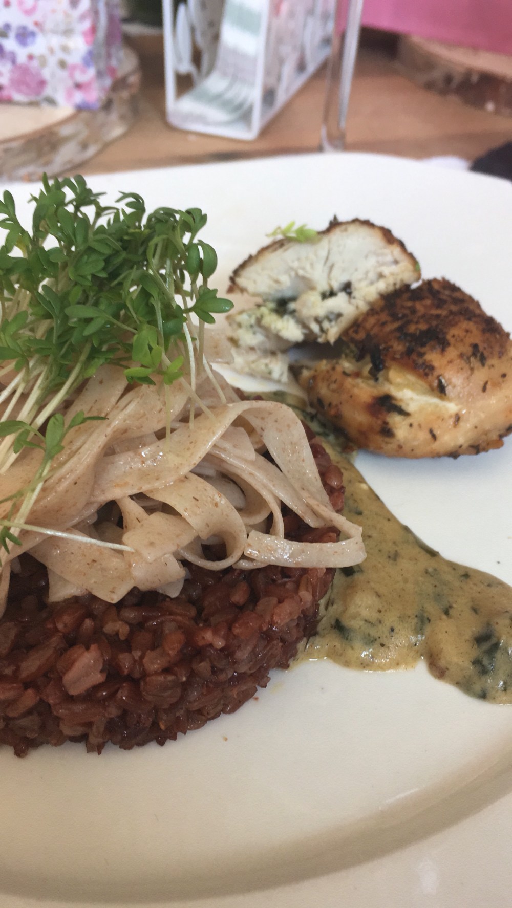 🌱Abschließend die Soße in die Mitte auf ein Teller geben, ein Putenbrüstl darauf geben. Mit Reis und Nudeln servieren.