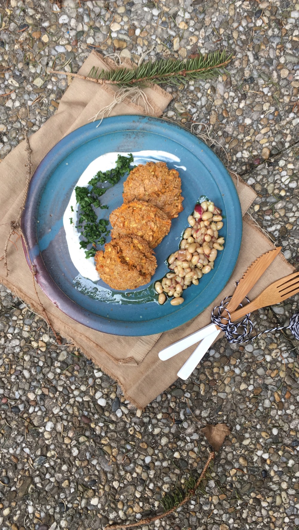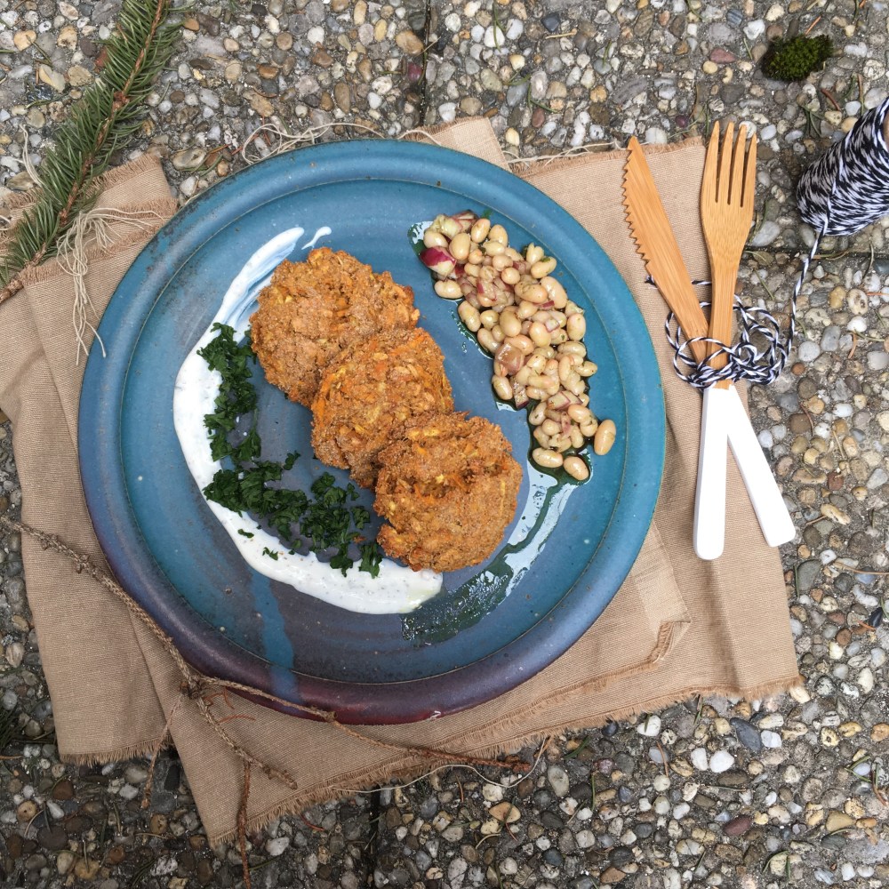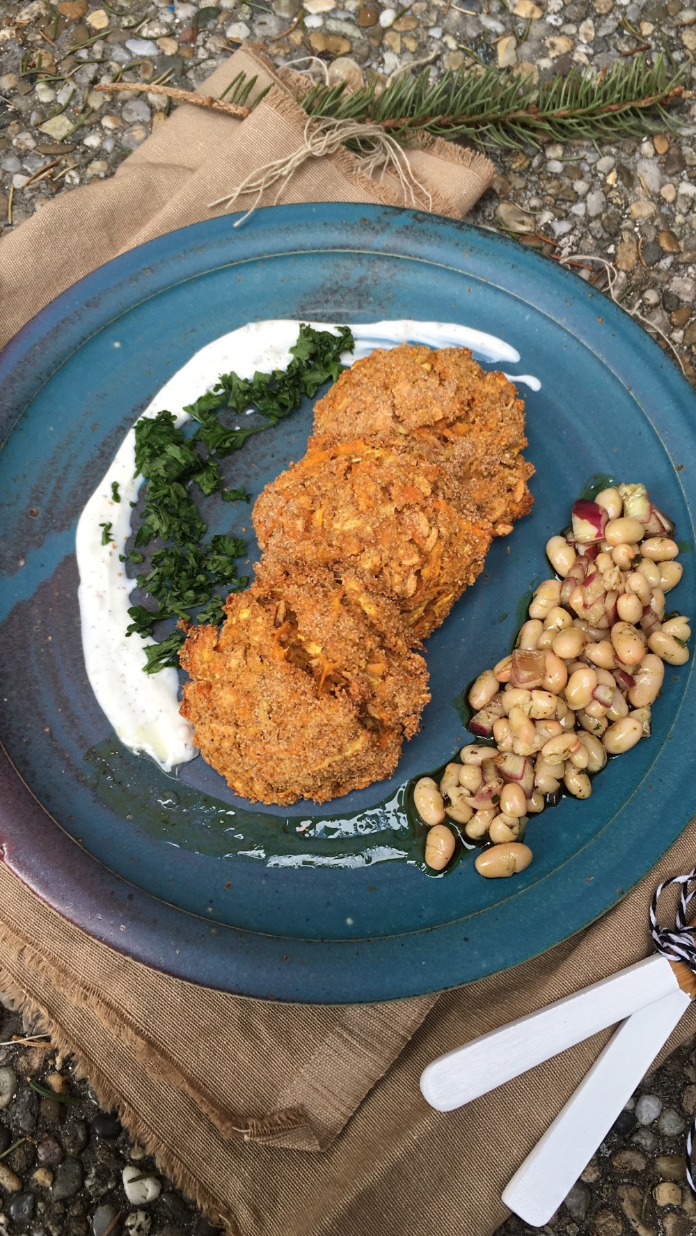 🥕Die Gemüselaibchen mit dem Joghurtdip und einen Bohnensalat oder Salat deiner Wahl servieren.