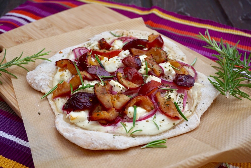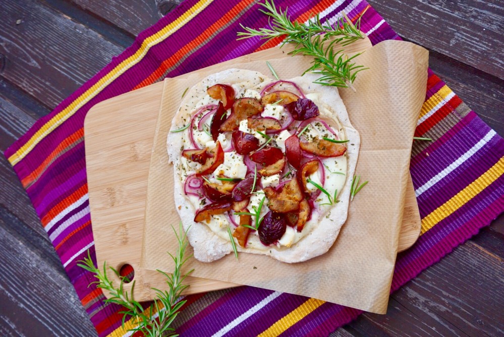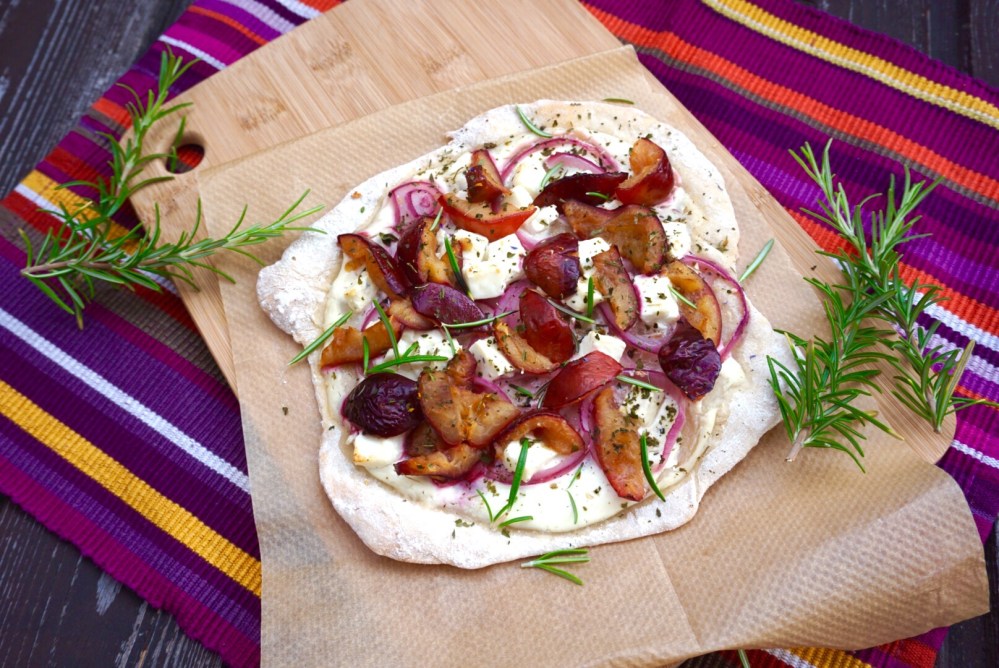 Einen Flammkuchen mit Zwetschken, Feta & Roter Zwiebel