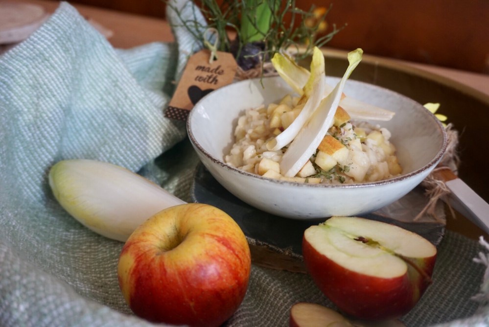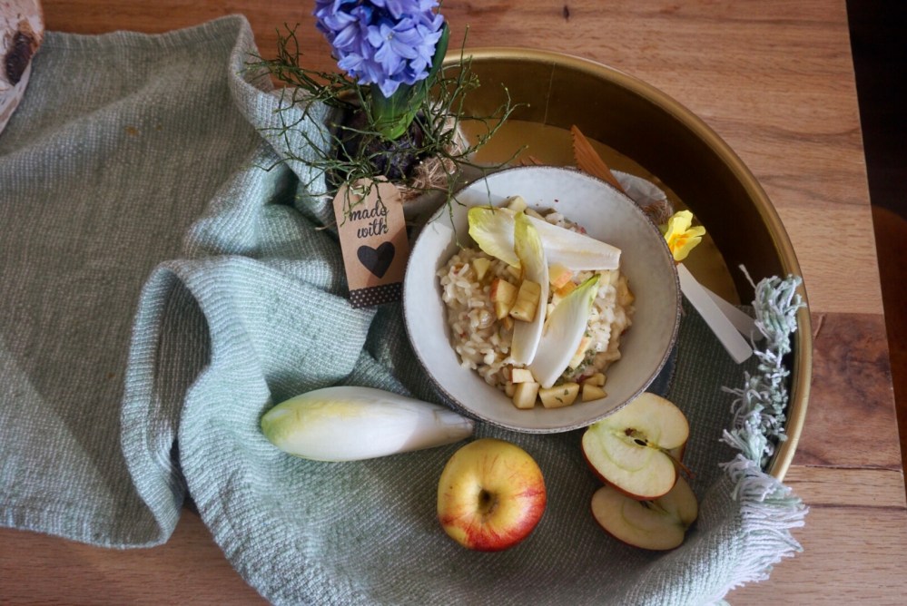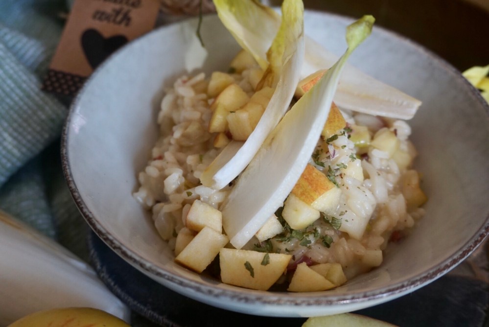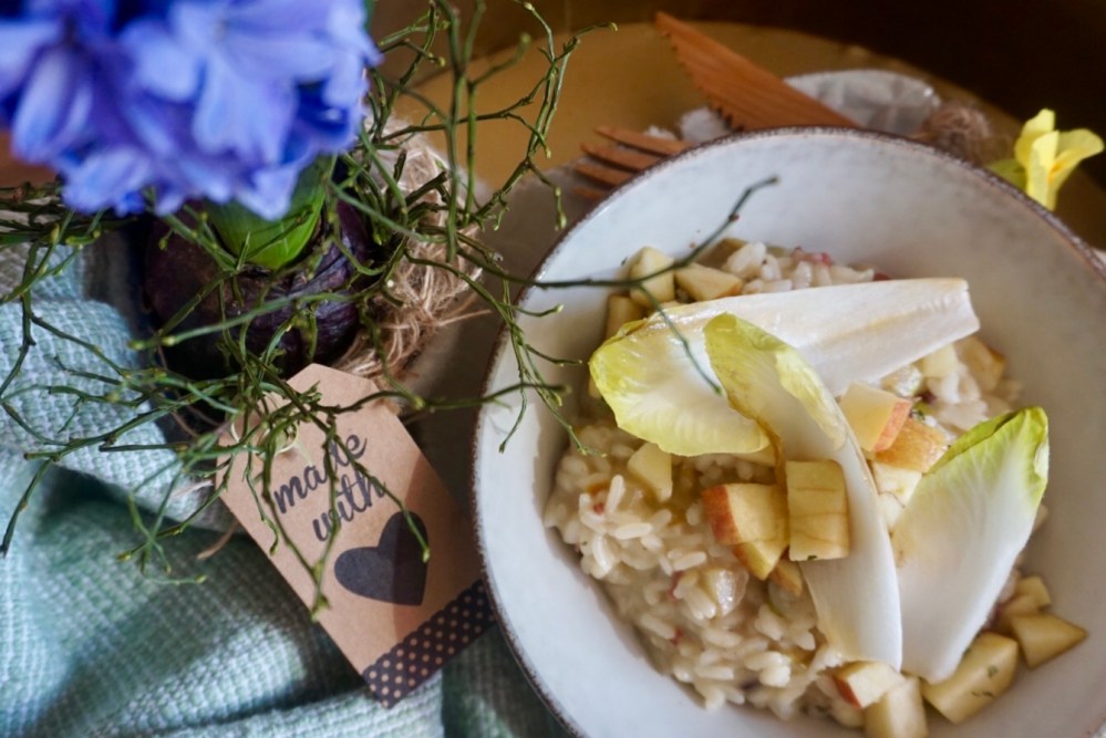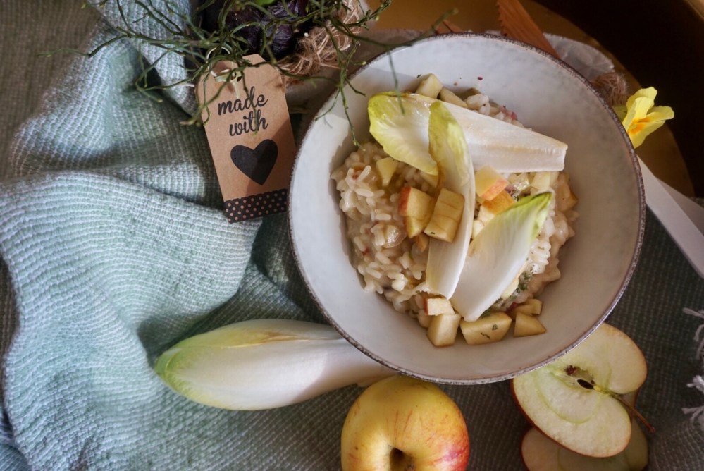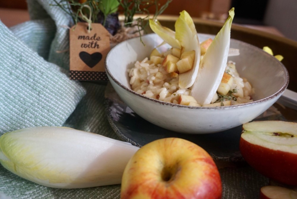 Ich hab mich dafür in’s Zeug gehaun und ein Chicoree Risotto mit Apfel und Speck für Euch gekocht 🧡