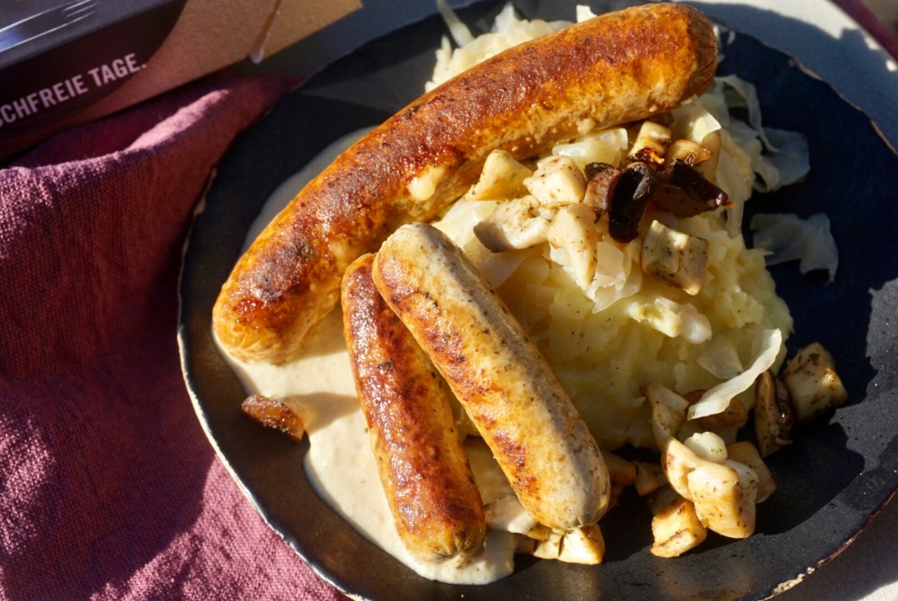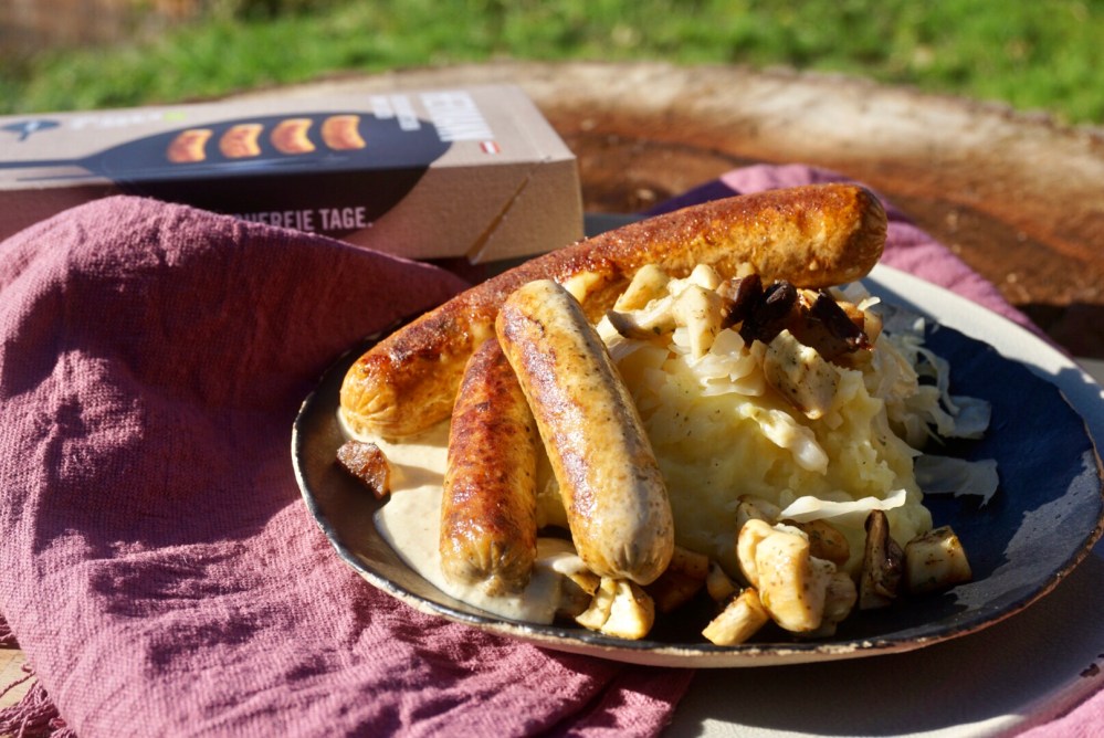 Es gibt Bratwürstel mit Kartoffelpüree/Krautsalat/Kräuterseitlingen/Senfsauce