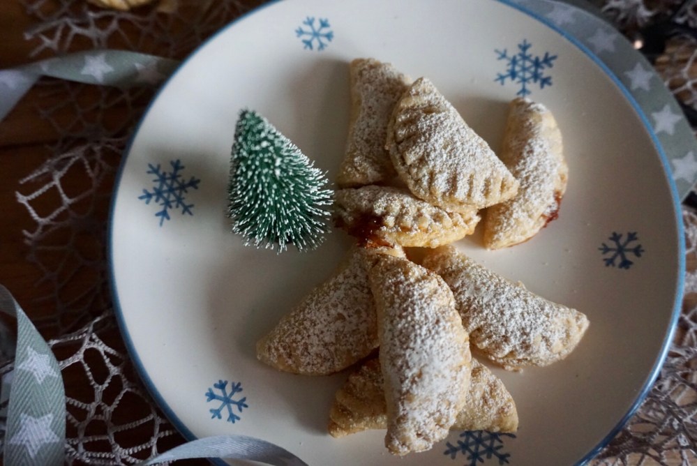 - Je 1 Teelöffel Marmelade auf die Kreise geben und zusammen klappen. Die Ränder gut mit einer Gabel andrücken. Auf ein vorbereitetes Backblech setzen und im vorgeheizten Backrohr bei 165-175 Grad 12-14 Minuten unter Aufsicht hell backen.