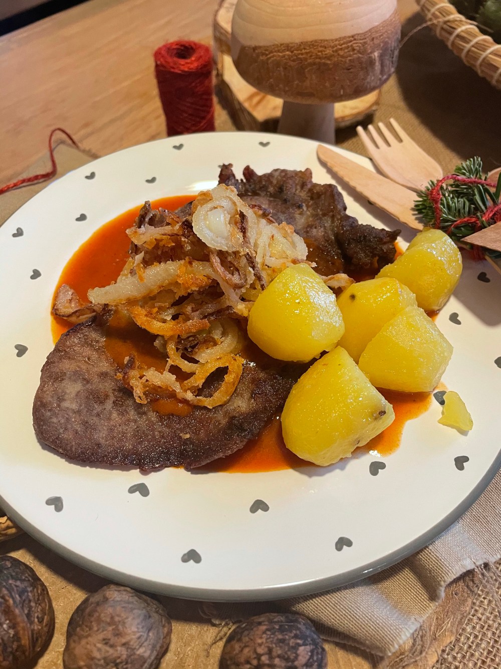 Der leckere Zwiebelrostbraten in der Tomaten Rotweinsoße mit Kartofferl & Röstzwiebel erinneet mich an früher und schmeckt soooo gut🥰👍🏻