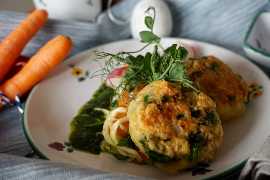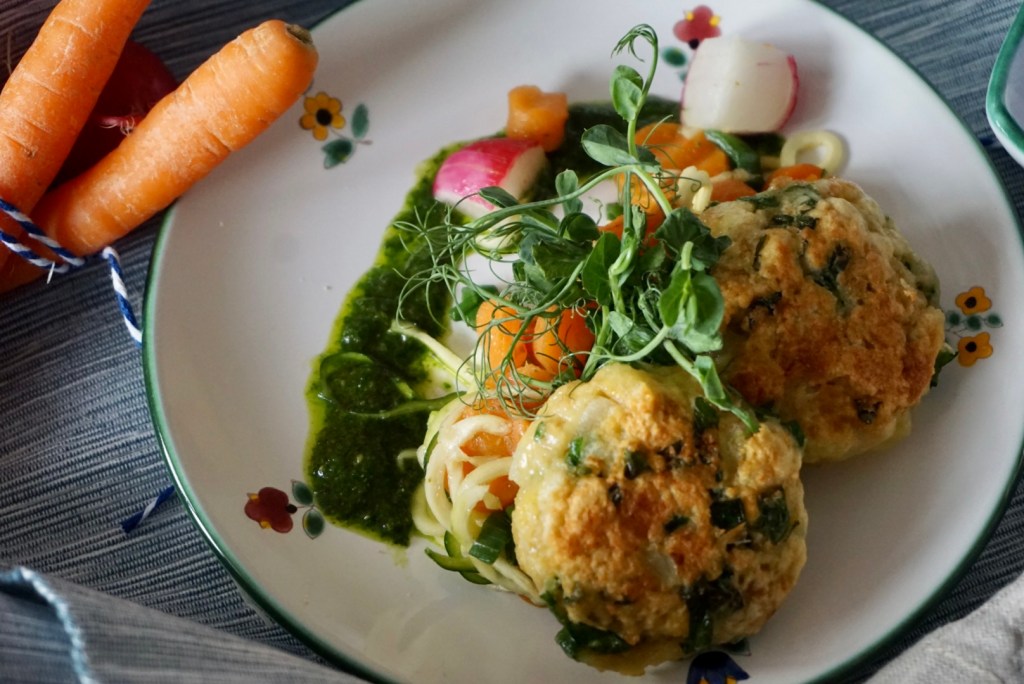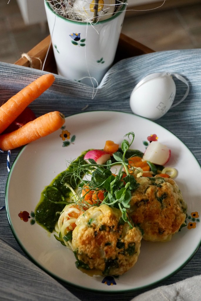 Bärlauch Kaspressknöderl auf Bärlauchpesto und Frühlingsgemüse💚