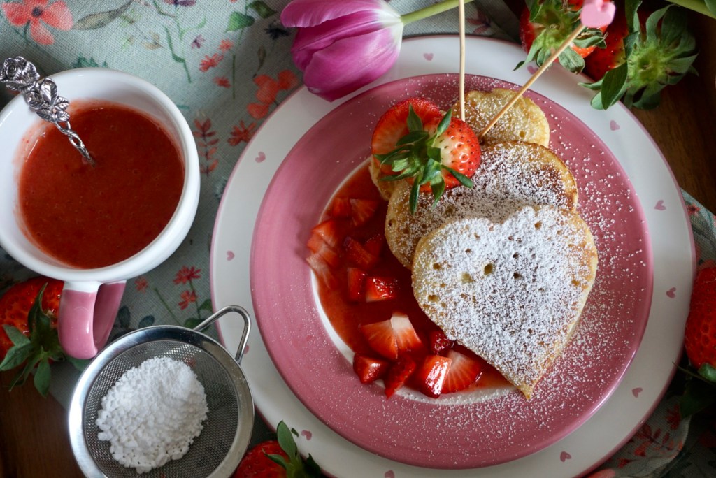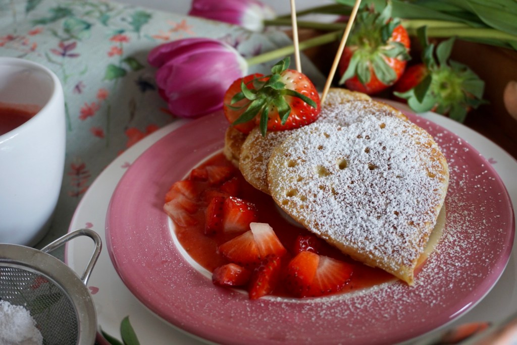 Meine leckeren Herz Pancakes mit Erdbeersosse machen sich super auf der wunderschönen Keramik von der Gmundner Keramik