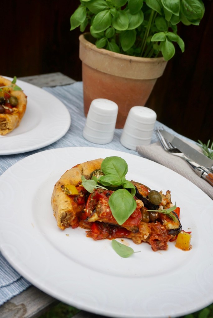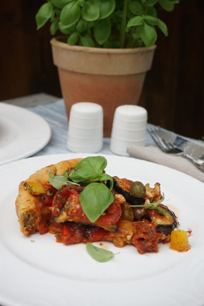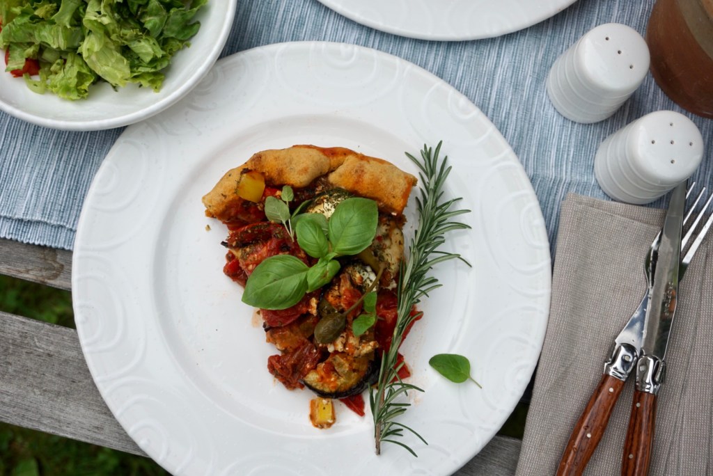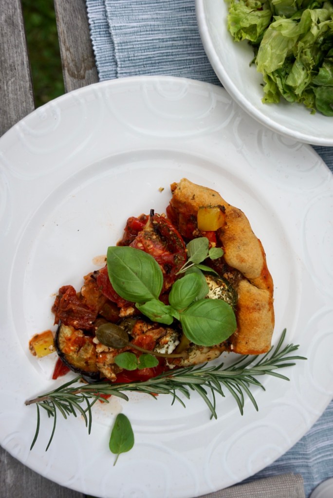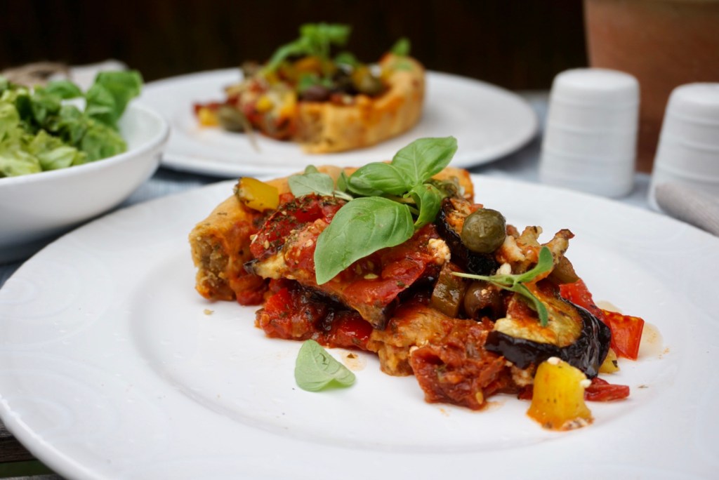 ☀️Die Sauce auf dem Tarteboden verteilen. Darauf Melanzani, Tomaten, Zucchini, Paprika, Kapern, Oliven verteilen, belegen.
