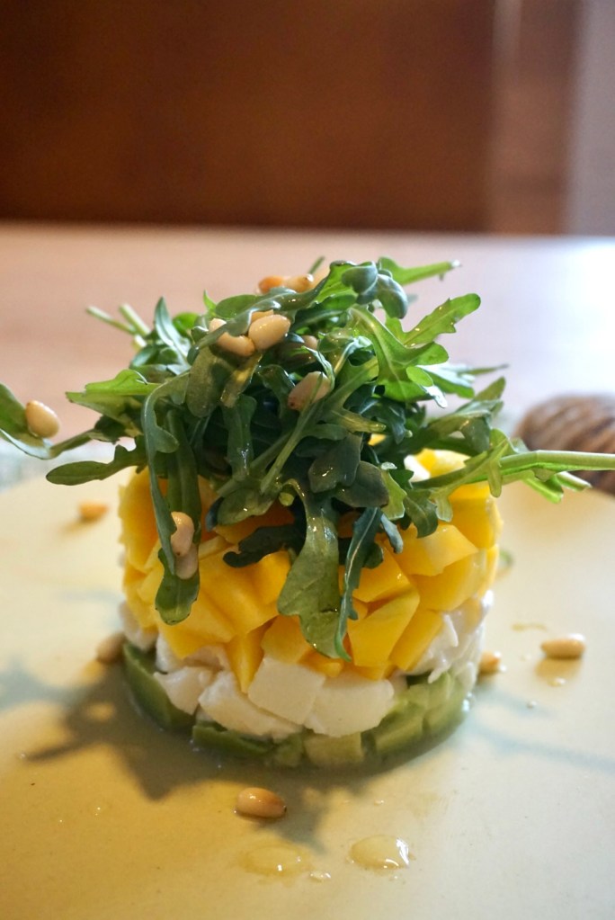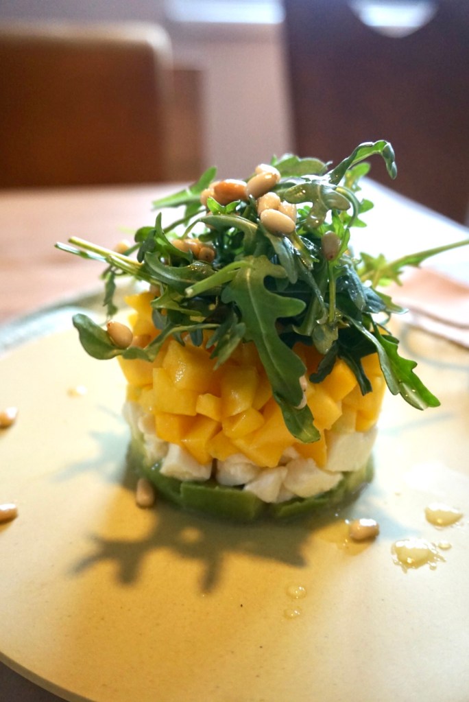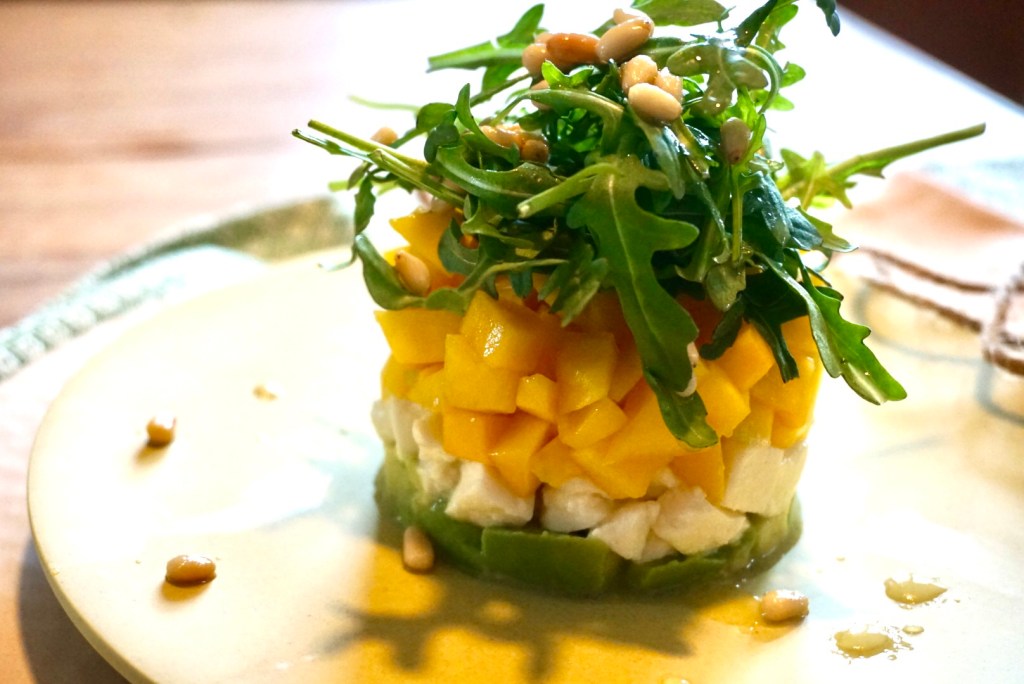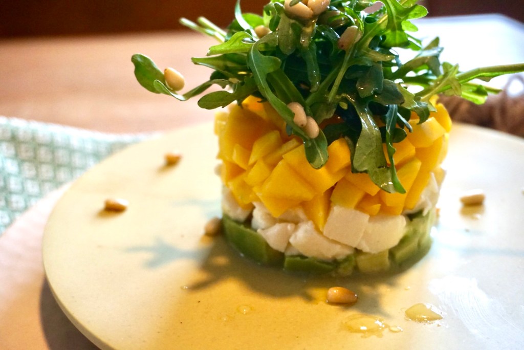 🌞Die Teller mit einem Dessertring anrichten und schichtweise Avocado, Mozzarella und zum Schluss die Mango hineingeben.